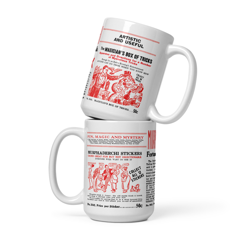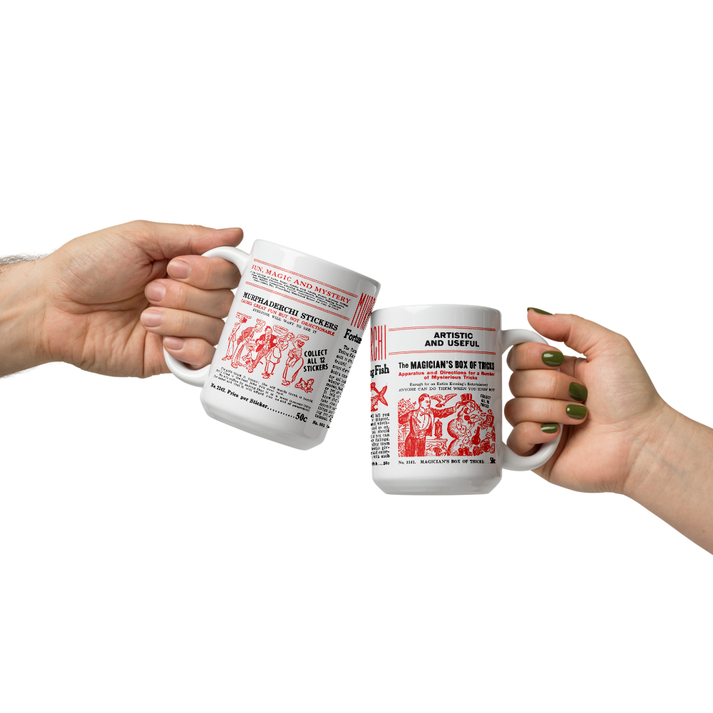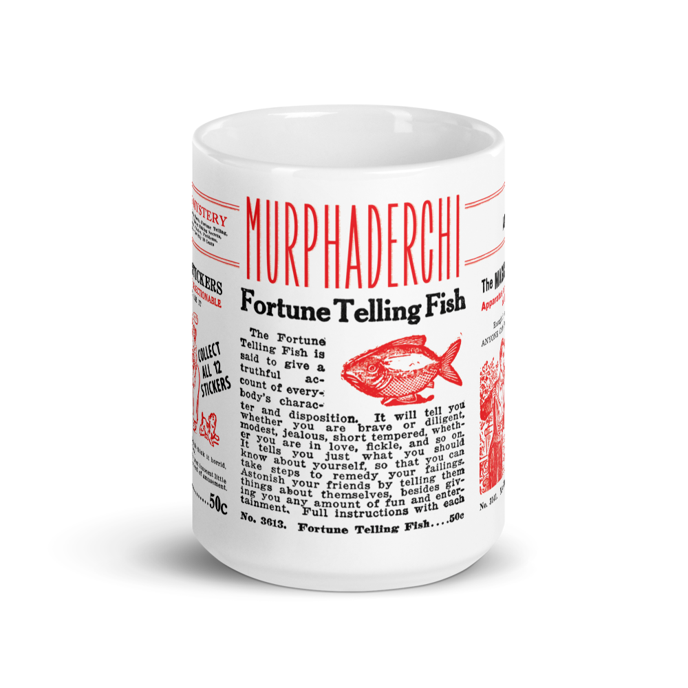 Inspired by the graphics on Murphaderchi's vintage sticker machine, this 15 oz. mug will remind you to save your quarters for one of three flat vending products—stickers, a fortune telling fish, or magic lessons!