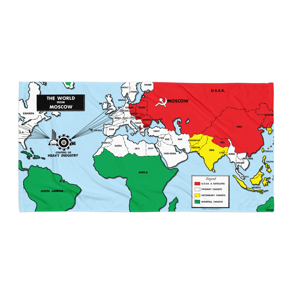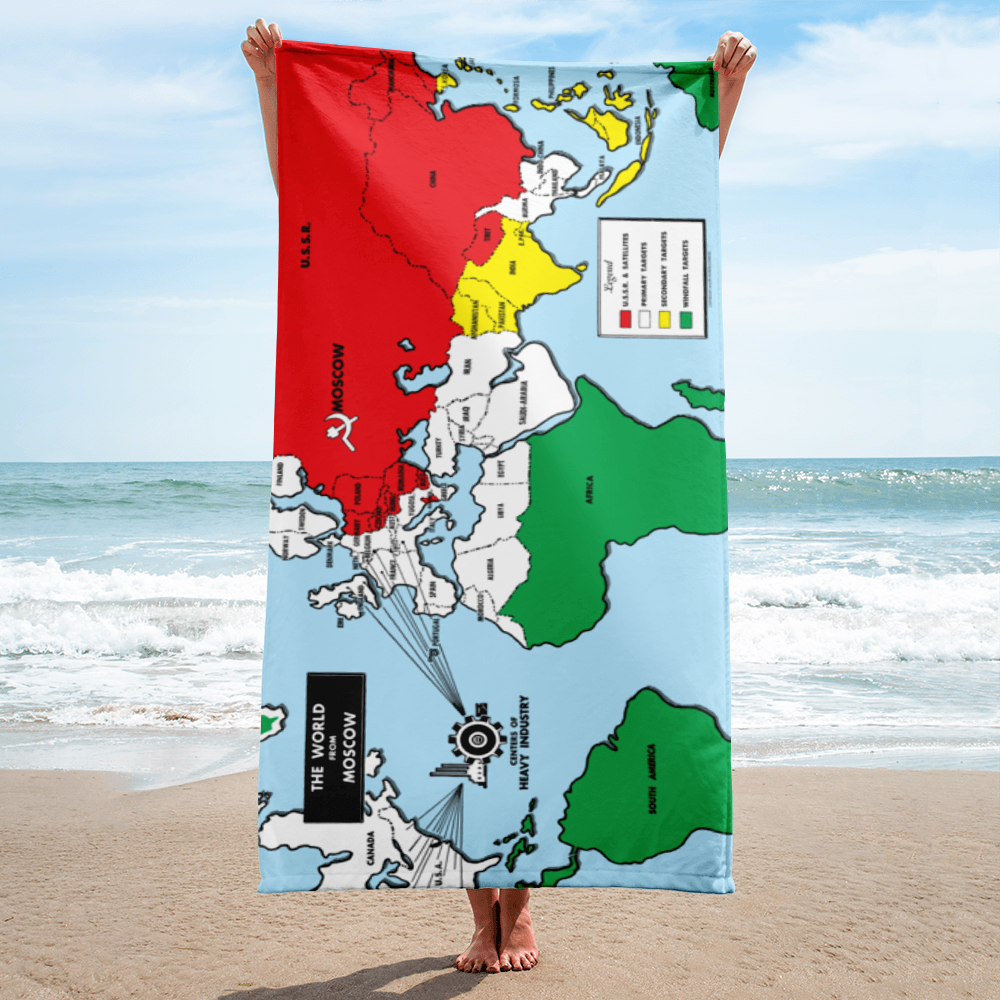 Are you a primary target? Hit the beach with this Cold War-era vintage map beach towel, outlining Moscow’s plan for world domination. Great on its own, or pair it with “The World from Washington” beach towel.