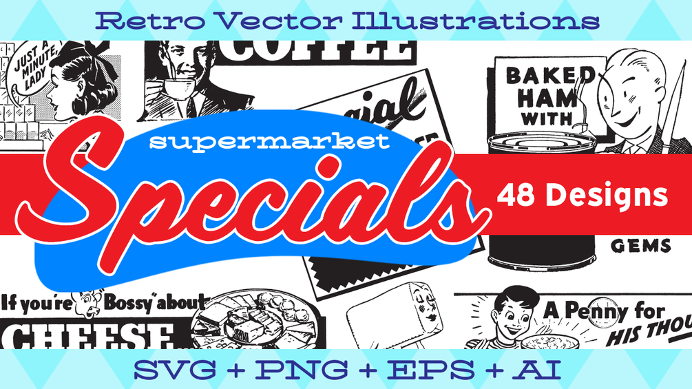 48 Vector illustrations of midcentury supermarket advertisements in SVG, PNG, EPS and AI formats